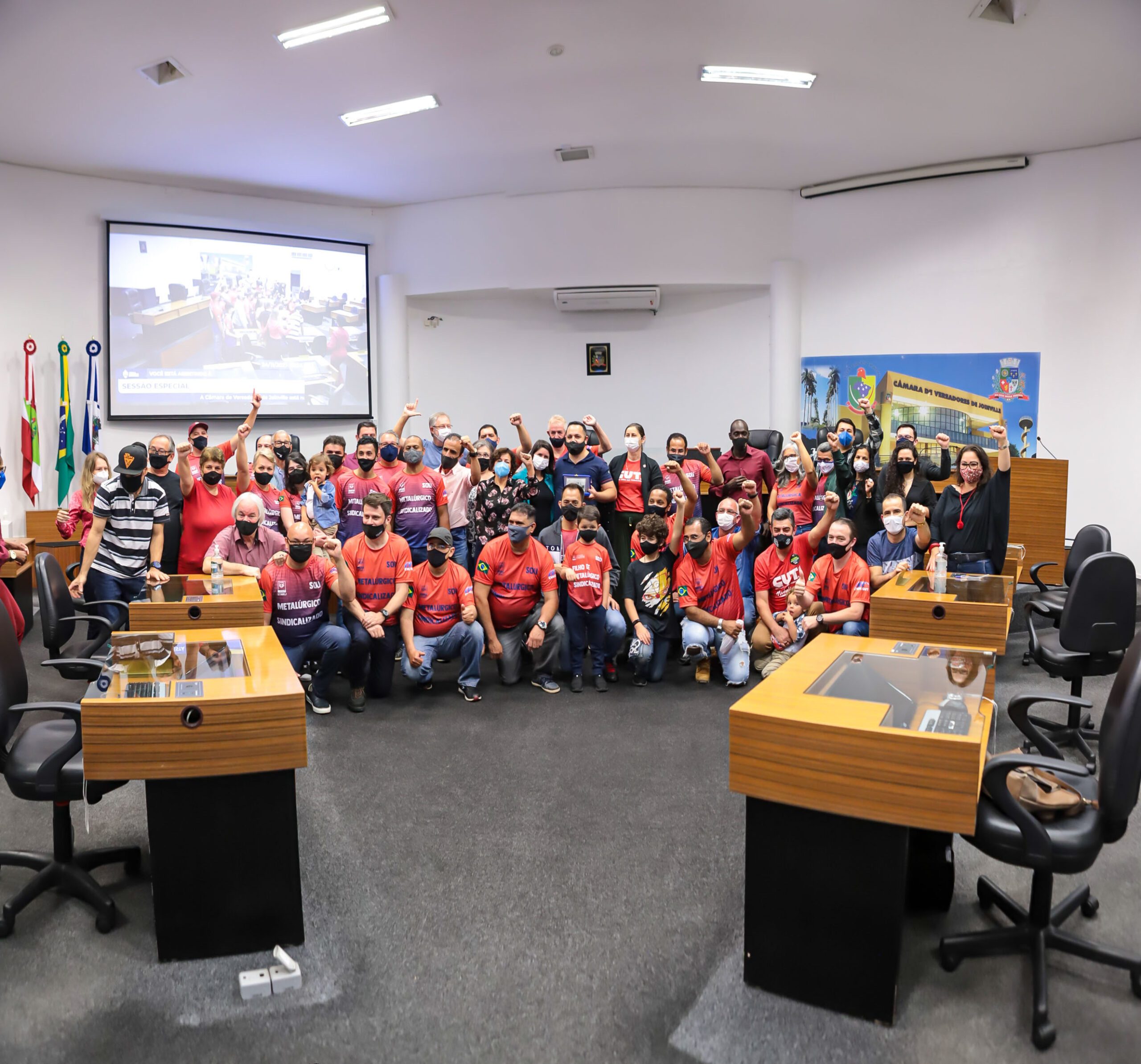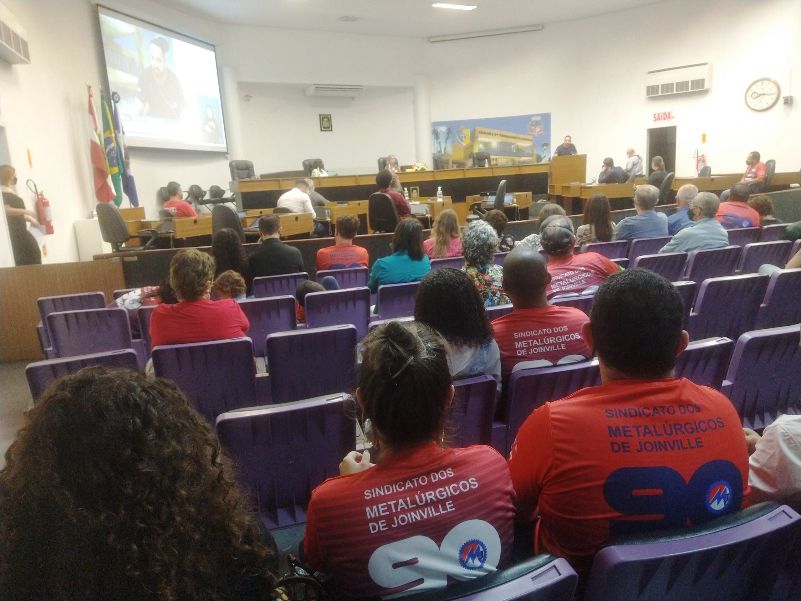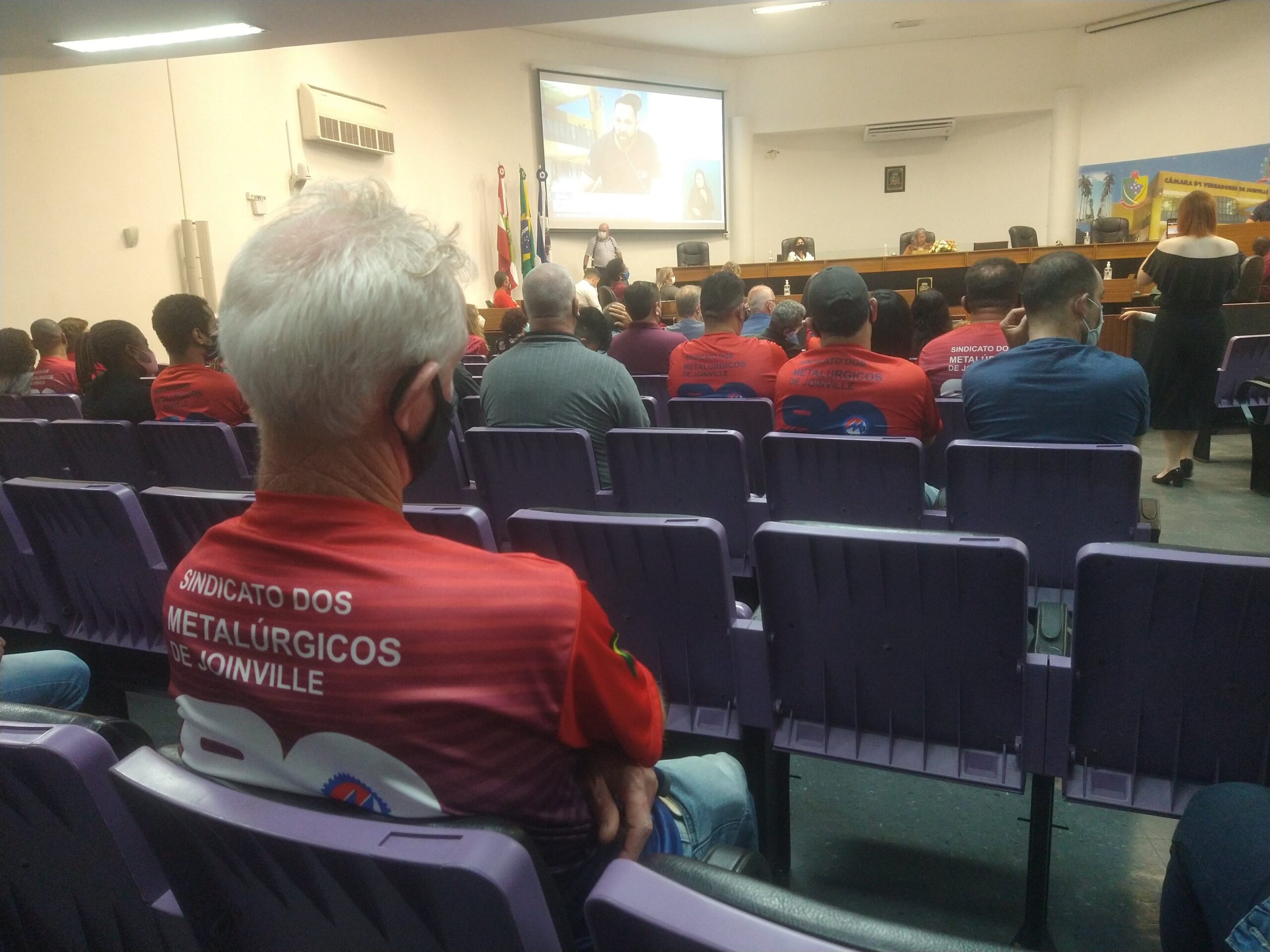 A Câmara de Vereadores realizou na noite de ontem (24) uma Sessão Especial em homenagem aos 90 anos do Sindicato dos Metalúrgicos de Joinville – (Stimej). A iniciativa da Vereadora Ana Lucia Martins (PT) enalteceu as 9 décadas de história, lutas e conquistas da categoria. Com a presença de diretores da entidade, trabalhadoras e trabalhadores de base, familiares, dirigentes de outras categorias e da presidenta da CUT/SC Anna Julia Rodrigues a noite foi de emoção e orgulho pela história grandiosa de um sindicato que nunca se furtou da luta em defesa da classe trabalhadora!